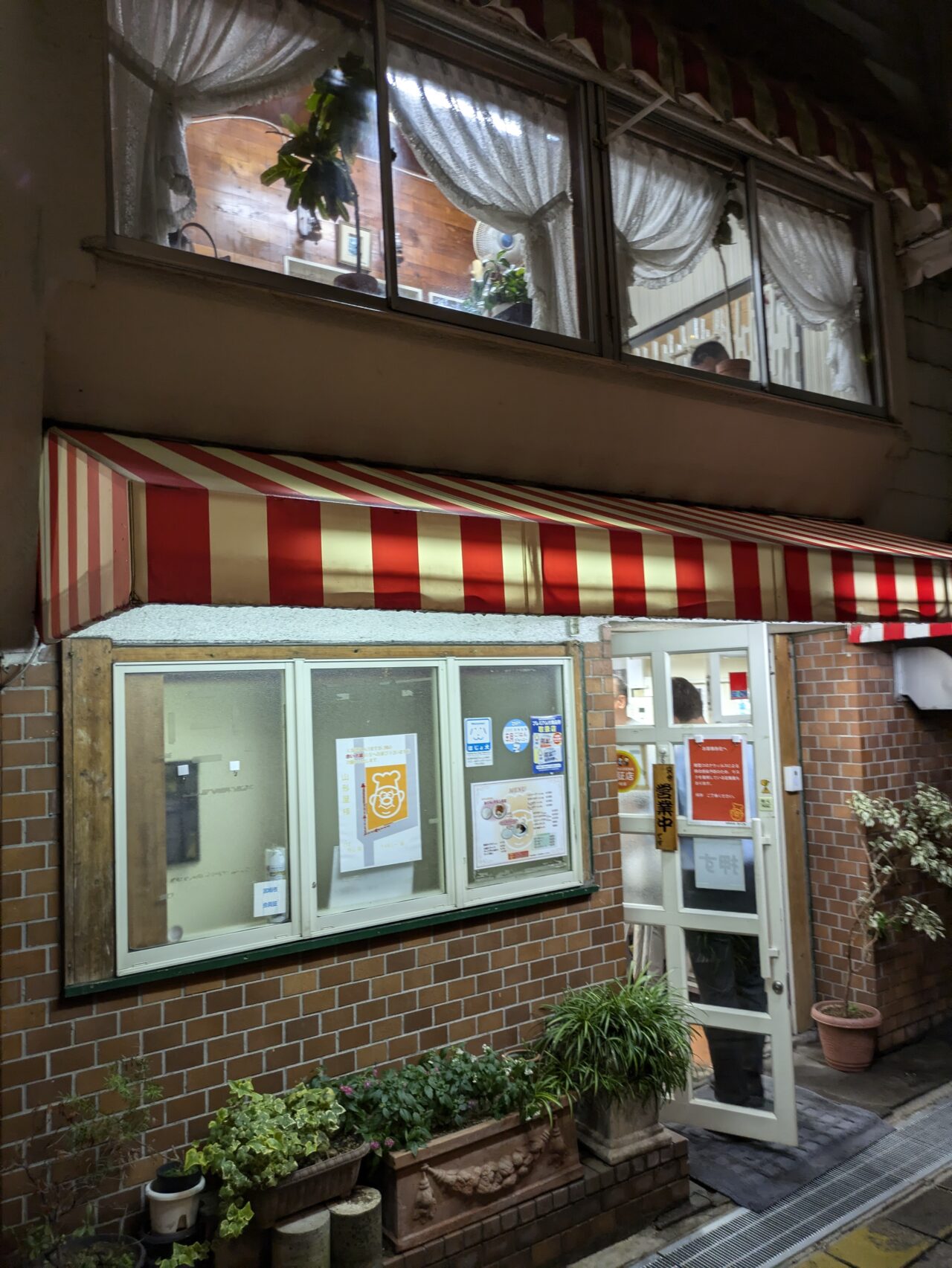 煉瓦造りの外壁に、赤と白のストライプのオーニング(ひさし)。 まるでおしゃれな洋食レストランのようでありながら、どこか昭和レトロな雰囲気が漂っています。 この、昔ながらの趣のある外観を見た瞬間、「ああ、これは絶対美味しいお店だ!」と確信しました。