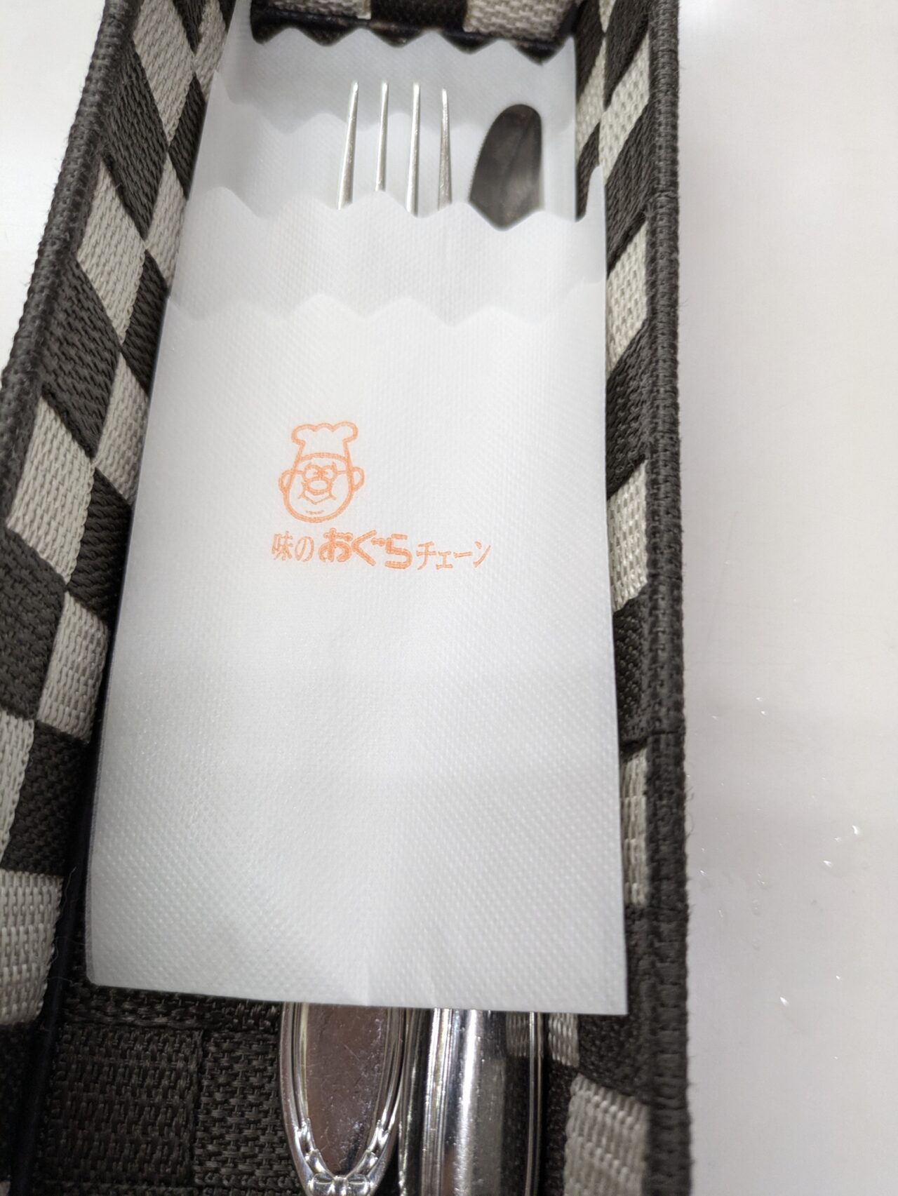 席に着くと、テーブルには可愛らしいコックさんのイラストが入った**「味のおぐらチェーン」のロゴ入りペーパー**に包まれたカトラリー(フォークやスプーン)が。 細部にまで、老舗のこだわりと温かさが感じられますね。