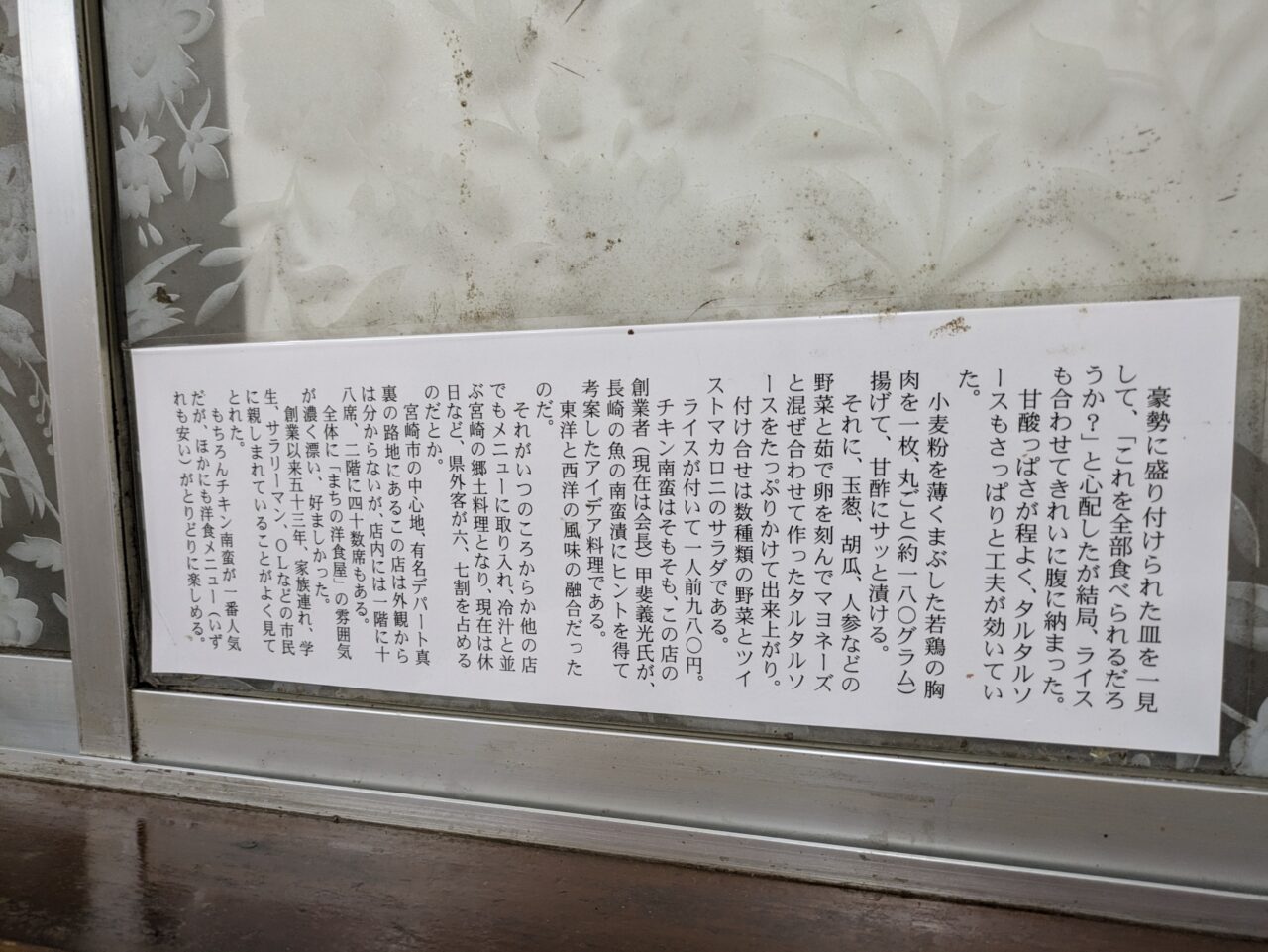 ただの「名物料理」というだけでなく、どこか懐かしい、安心感のある味でした。お店のレトロな雰囲気と相まって、子供の頃に家族と行った洋食屋さんを思い出すような、心も満たされる一皿。出張で疲れた身体に染み渡る、宮崎のソウルフードを心ゆくまで堪能できました!