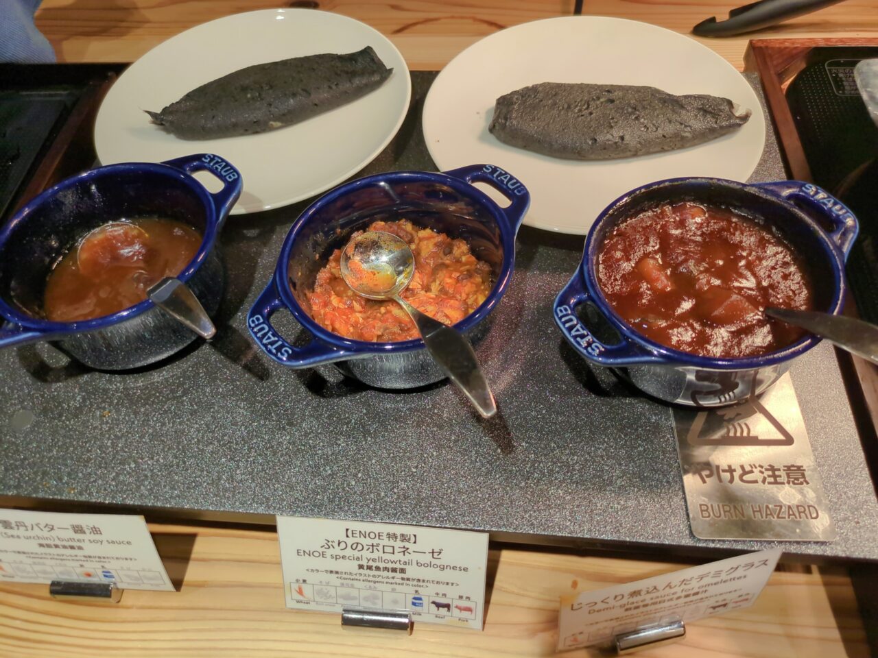デミグラス、ブリのボロネーゼ、雲丹バター醤油の三種類のソースをかけてお召し上がり。